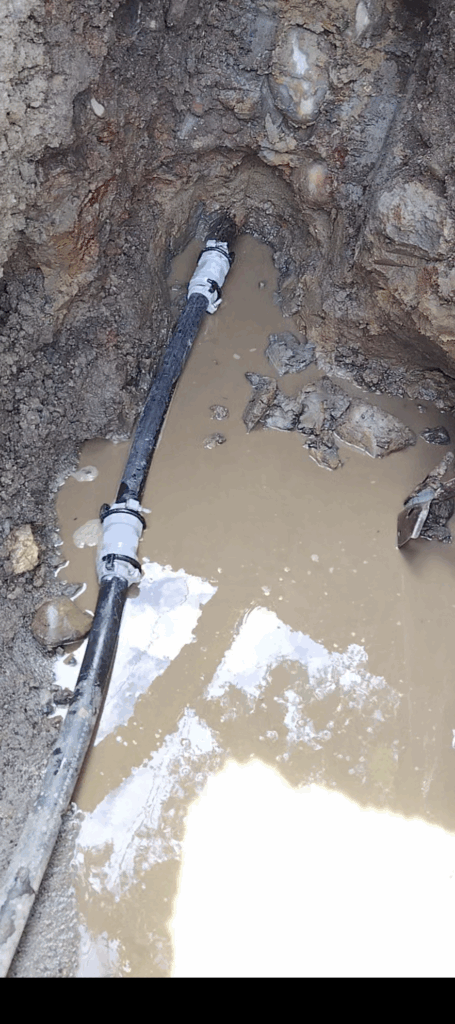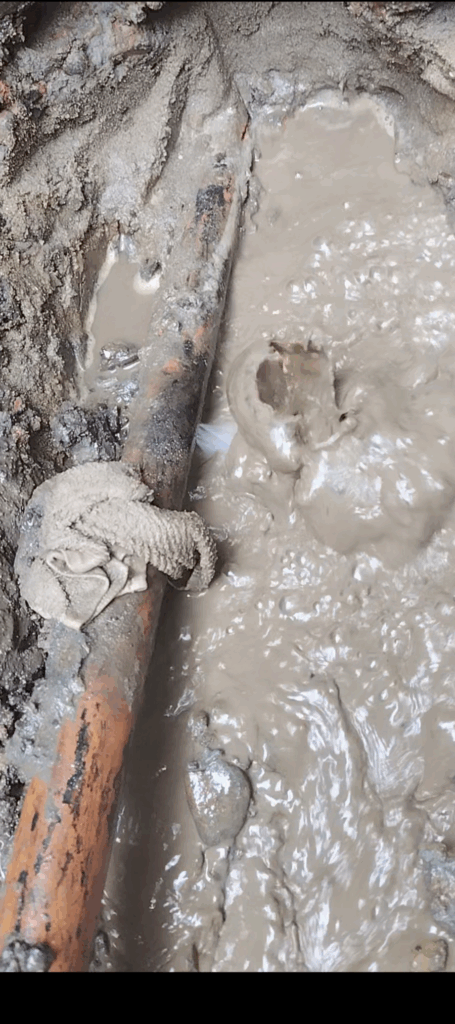 穴を掘って、漏水の修理をします。漏水の原因は配管の老朽化による破れでした。